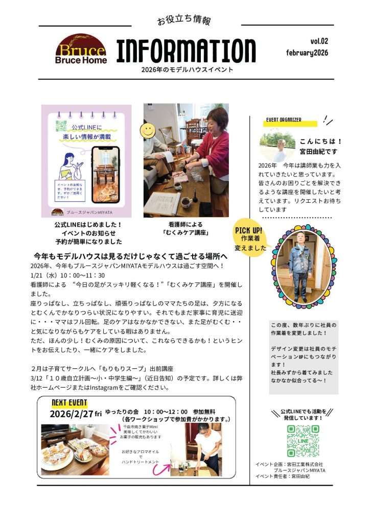 以下は、ニュースレターの裏面に掲載しております「お役立ち情報<INFORMATION>」です。”見るだけじゃなくて過ごせる場所へ”をテーマにモデルハウスにて1月に開催したイベントの報告や、今後開催予定のイベントのご案内をしております。