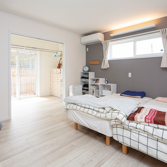 ベッドの配置を考慮して窓を高めに設置して間接照明を付けました。