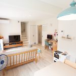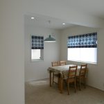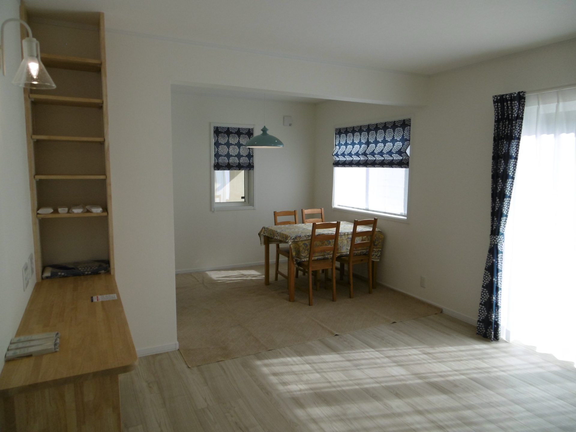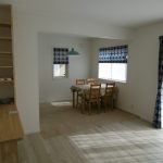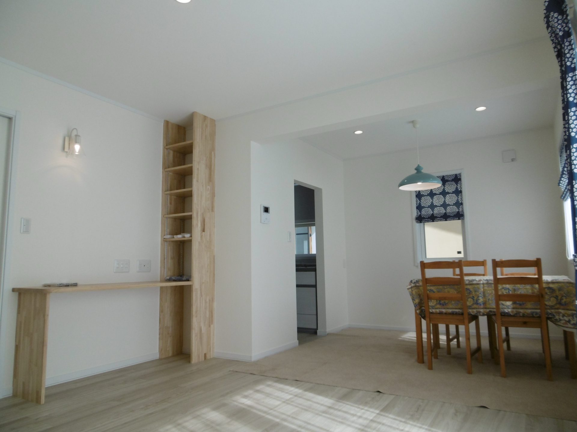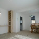 リビングダイニング。左は造り付けの棚付カウンターデスク。