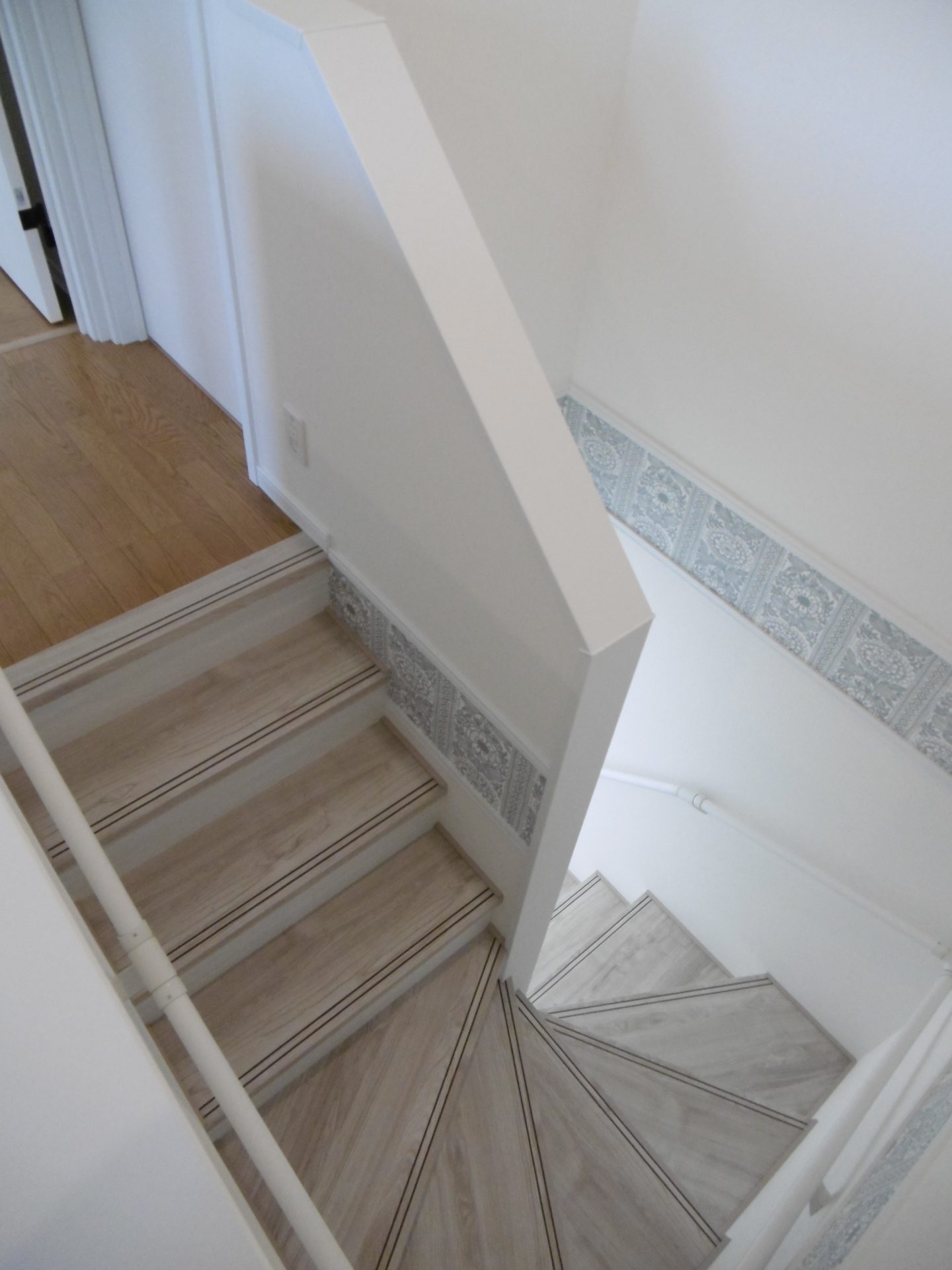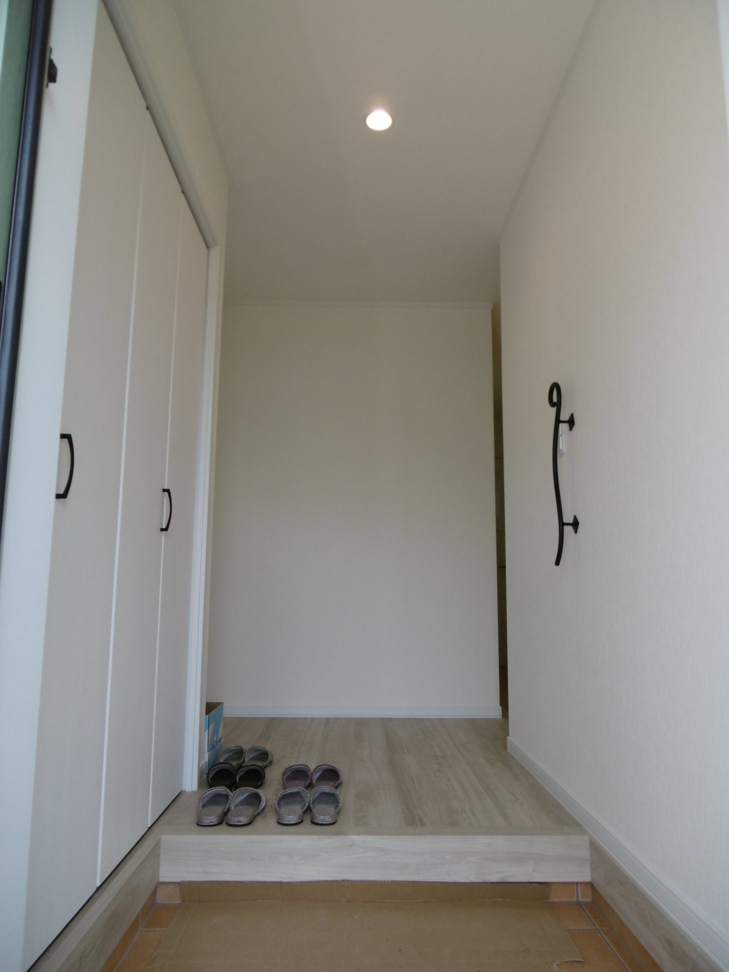 玄関~1F廊下。右の手すりはご支給いただいたアイアン製。