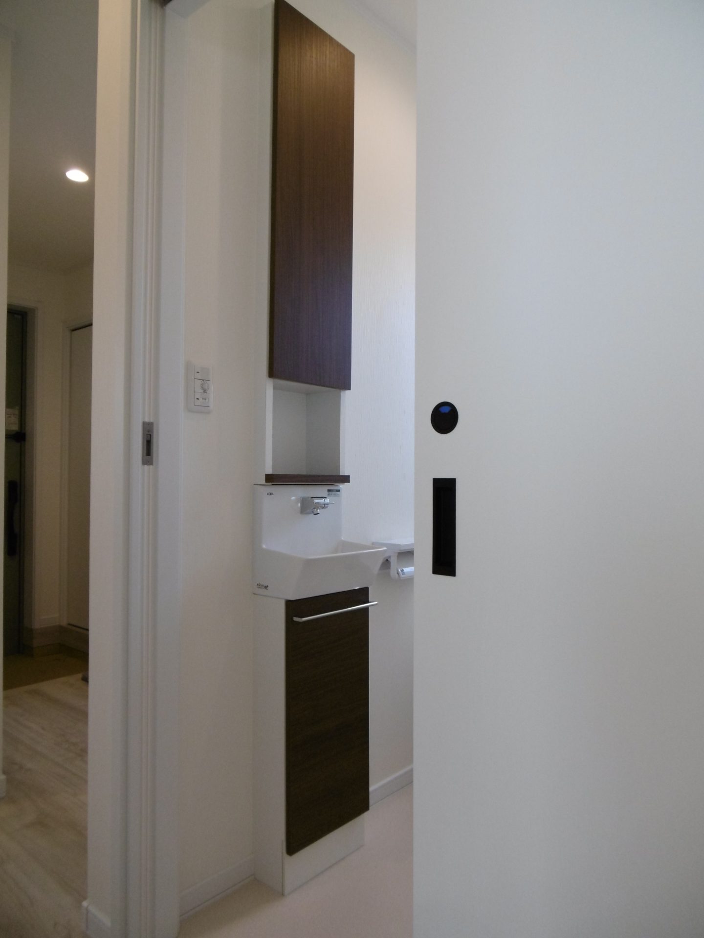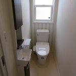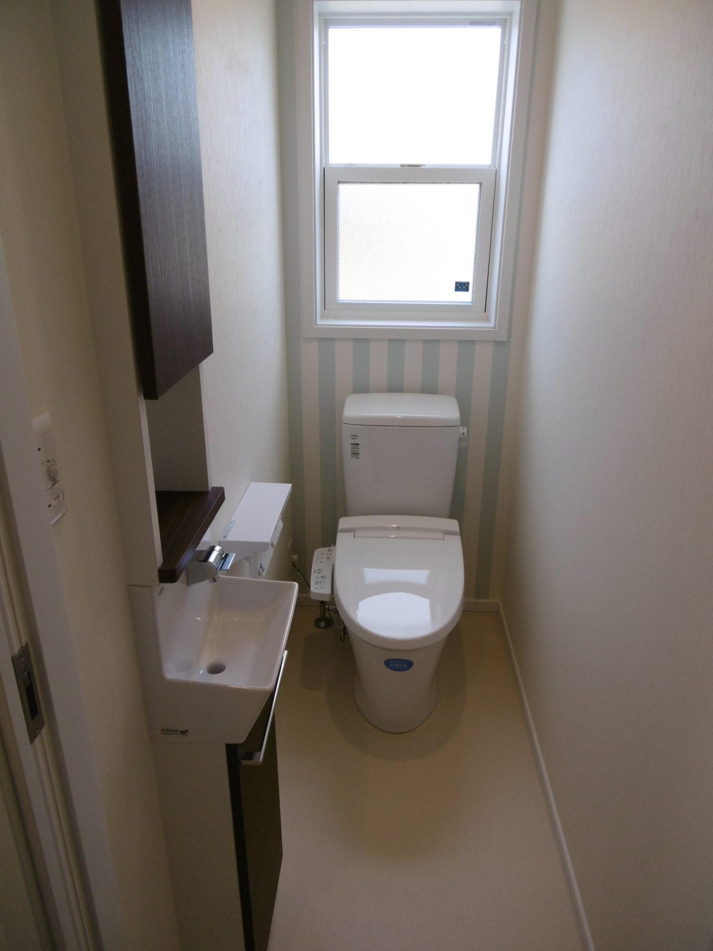トイレ。正面の壁はストライプのアクセントウォール。左にあるのは...。